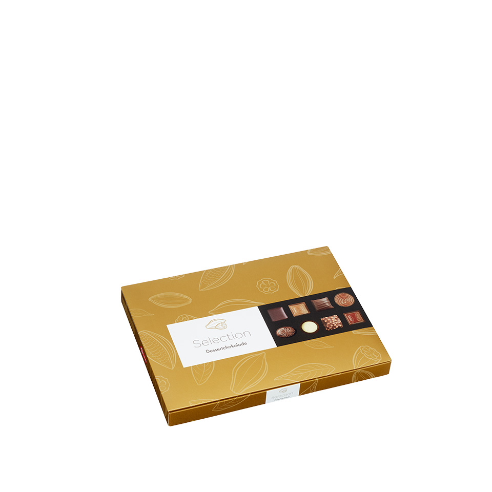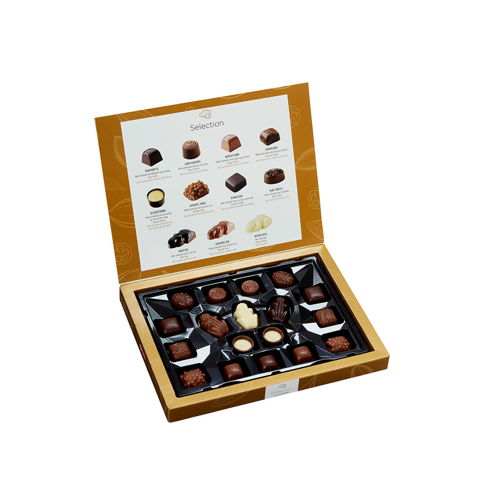 Mieszanka pralin w czekoladzie deserowej, mlecznej i białej nadziewanych kremem marcepanowo-kokosowym, toffi, nugatem orzechowym, trufli rumowej i mięty. Całą kompozycję dopełniają czekoladowe żabki w trzech odsłonach białej, miętowej i karmelowej.